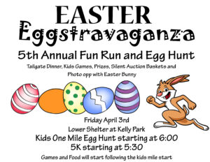 The 1 mile egg hunt will kick off at 6:00 pm. Eggs stops will be spread throughout the course. Kids 12 and under can enjoy balancing collecting eggs with exercise. Eggs will be filled with candy or prize tickets redeemable at the pavilion. The 5K run will start at 5:30 pm.